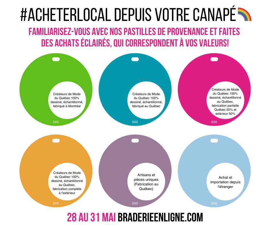 Chaque pastille explique la provenance des produits de nos designers afin que vous puissiez faire des choix éclairés, qui correspondent à vos valeurs. Choisissez vos couleurs et vos coups de coeur!